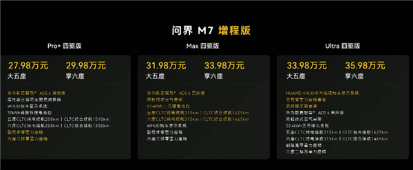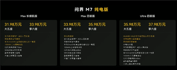 同时,新款M7增加了纯电车型,也是分为三个大配置,全是100度三元锂,区分点是四驱、HUD、零重力等等,大顶配的价格干到了37.98万。