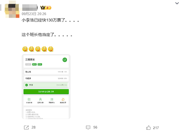 9月24日消息,近日,网络上出现了一条“李浩129万多票当选班长”的截图,引发网友围观。