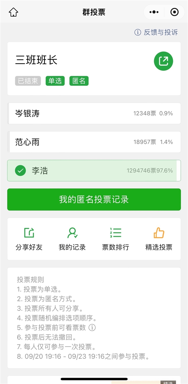 据了解,9月22日至23日,某校“三班班长”竞选通过微信小程序“群投票”发起,候选人三名,包括李浩。