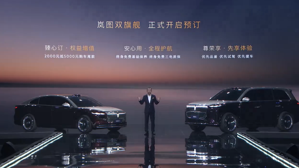 活动最后,岚图汽车科技股份有限公司董事长卢放宣布,岚图追光L与岚图泰山正式开启预售,支持2000元订金抵扣5000元购车尾款等多种权益。