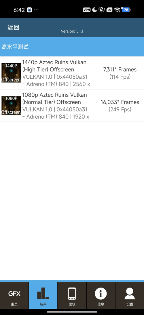 GFX Bench中,我们可以看到2K Aztec Ruins Vulkan,帧数为114FPS,1080P则为249FPS,综合性能表现出色。