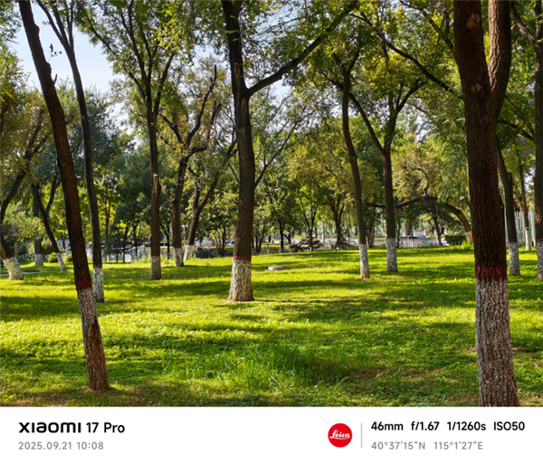 通过样张可以看到,在2倍光学变焦的情况下,阳光透过树枝,撒到地面上的光斑非常漂亮,小米17 Pro都能很好地还原,非常漂亮。