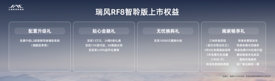 此外,从即日起到3月31日,所有大定用户在享受预售价的基础上现金直减 8888元。除了智聆版正式上市之外,瑞风RF8鸿蒙版同步启动预售,预售价格为20.99~25.99万元,即刻预订享受订车无忧礼、用车无忧礼两大权益,并将于4月开启交付。