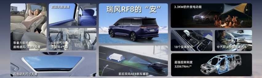 第一,瑞风RF8是行业首款搭载华为车机系统的MPV,操作系统带来天花板级别的智能座舱体验。第二,也是行业首款搭载星火认知大模型的MPV,借助讯飞星火大模型学习用户行为,智能语音交互体验便捷。第三,行业首款匹配3DHT智慧电混的MPV,带来优于单档或两档DHT混动系统的动力性能体验。第四,44.55度大圆柱电池,使之成为纯电续航里程最长的插电混MPV。第五,行业首款获得中国汽车安全大会“中国十佳车身”“最佳结构奖”双奖的MPV,安全性能行业领先。第六,行业率先搭载的前后双向AEB智能制动辅助系统,全面保障行车安全。第七,瑞风RF8成为首款通过中汽研六维电安全认证的MPV,416项严苛测试全部表现优异。第八,行业第一个获得中汽研“中国健康汽车”认证的MPV,给予用户每一程的清新健康座舱体验。