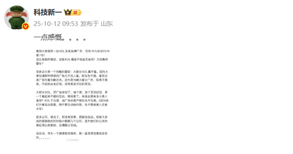 对此,博主@科技新一在微博上就此发声,揭露KOL营销领域的深层乱象,相关言论迅速引发关注。