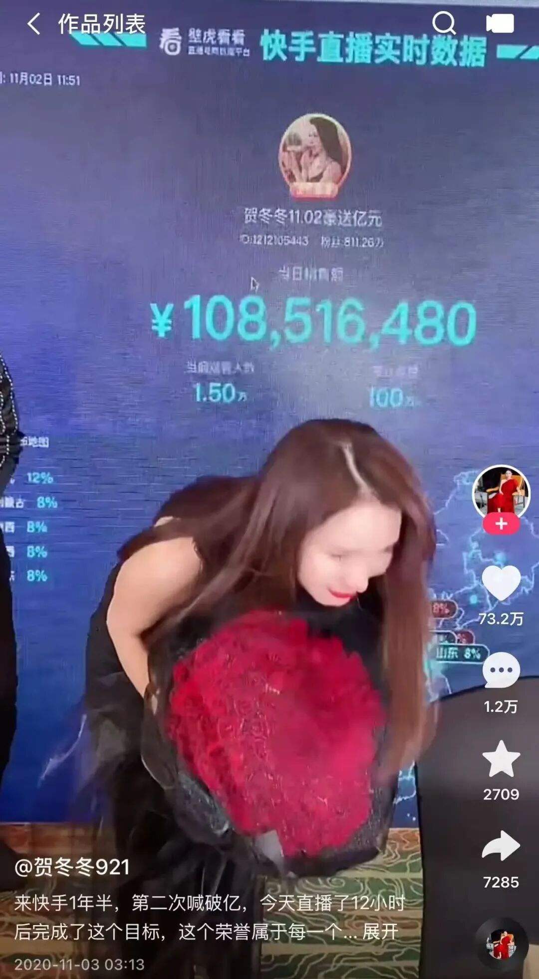贺冬冬,快手2300 万粉丝大主播,梦泉品牌创始人,带货战绩多次破亿,妥妥的头部网红。