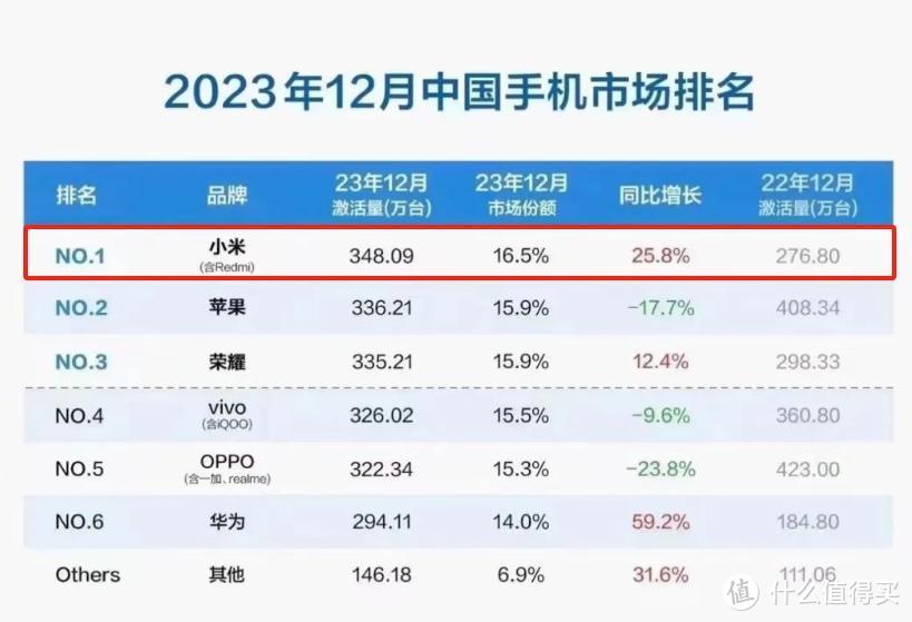 而2023年四季度,小米手机的激活量在国内排名第二名,仅次于苹果,比华为、荣耀、OPPO、VIVO还要高。12月份更是勇夺中国市场第一名,比苹果还要高了。