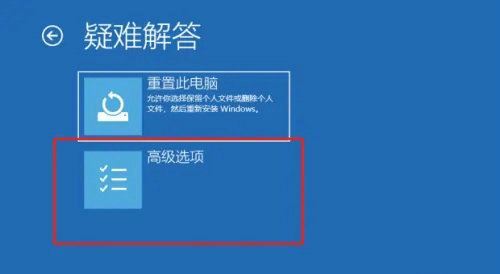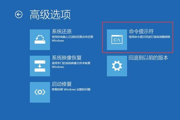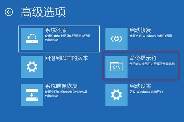 步骤2:进入恢复环境后,依次选择【疑难解答】>【高级选项】>【命令提示符】。