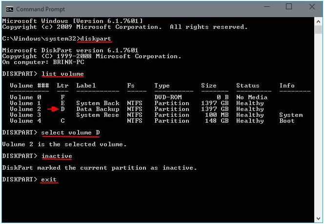 list volume(列出所有卷) select volume D(根据实际情况将D替换成需要设置为非活动分区的分区驱动器号) inactive(将选择的分区标记为非活动分区) exit(退出)