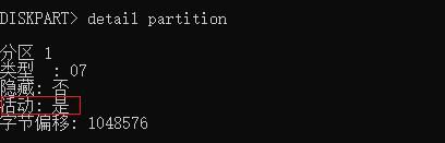若您不清楚分区是否是活动分区,可以在【list volume】列出分区之后,输入【select volume n】(n可以替换成不同的卷编号或驱动器号),之后输入【detail partition】即可查看所选卷的分区属性,如下图显示“活动:是”,这代表所选的卷/分区是活动分区。