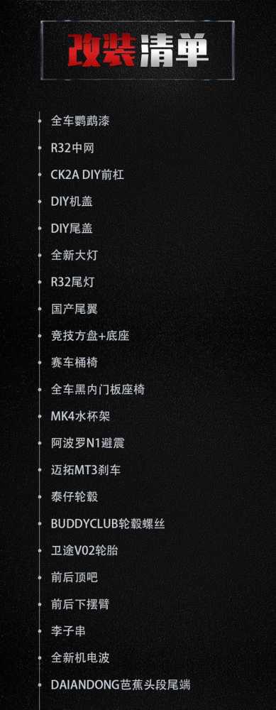 "外观方面,除了DIY尾盖和R32尾灯之外,还换上了CK2A DIY前杠、R32中网、DIY机盖、全新大灯、国产尾翼,喷上了全车银色鹦鹉漆,最终出来的效果如果不看侧面,还是很像R32,挺唬人的!"