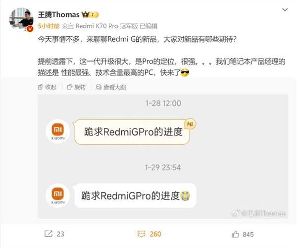叮当号2月6日消息,小米公司王腾预告,Redmi G游戏本即将登场,这一代升级很大,是Pro的定位,是性能最强、技术含量最高的PC。