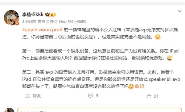 为此,李楠再次发文解释。他认为,要把Vision Pro看成一个娱乐设备。大家在iPad Pro上不会做大量输入,因为数据显示大家在iPad Pro上刷社交网站、看视频玩游戏的较多。
