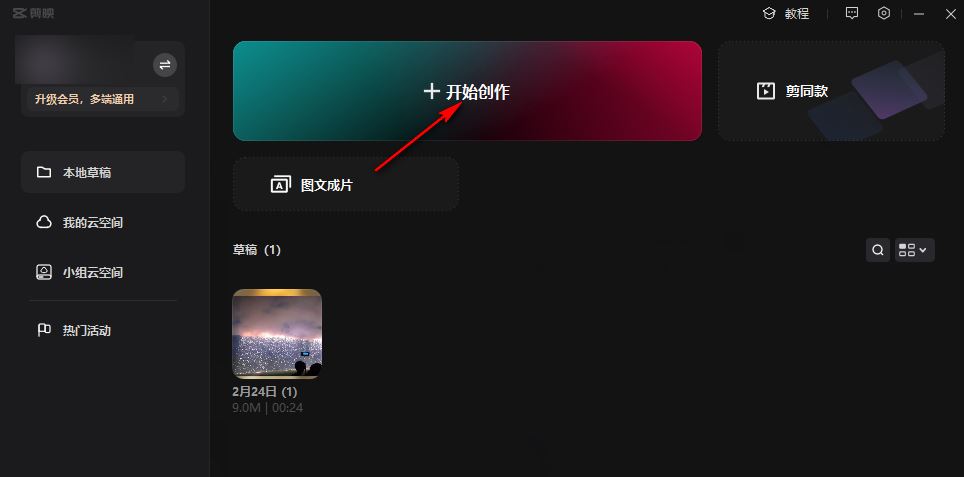 1、在制作之前,我们需要先准备好两张和自己视频画面一样大小的纯色背景图片,接着打开电脑中的剪映软件,然后在剪映的首页点击“开始创作”选项。