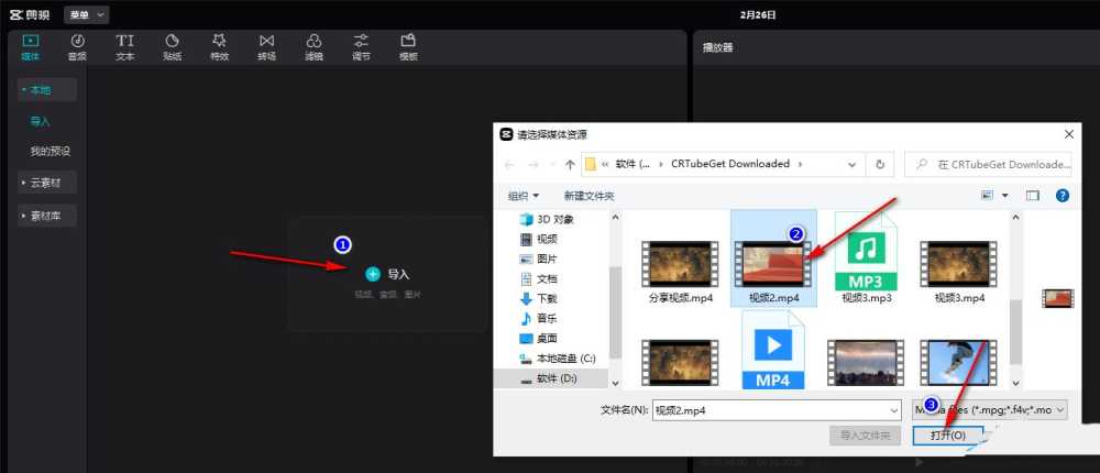 2、进入创作页面之后,我们先点击“导入”选项,然后在文件夹页面中将自己准备好的素材都添加到剪映中。