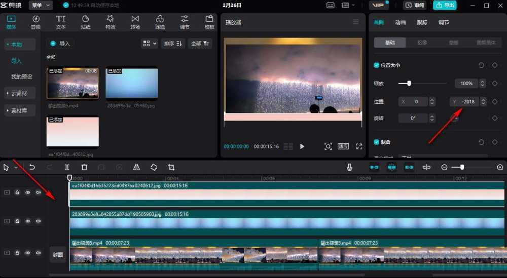 3、添加好素材之后,我们将素材都拖入轨道中,如图所示让素材都与视频长度一致,然后分别点击两个背景轨道,再在右上角将“Y”改成一样的大小,这里的大小取决于我们的进度条占视频的大小,我们也可以使用世界拖动的方法,在画面中选中纯色背景,将其向下拖动到合适的位置即可。