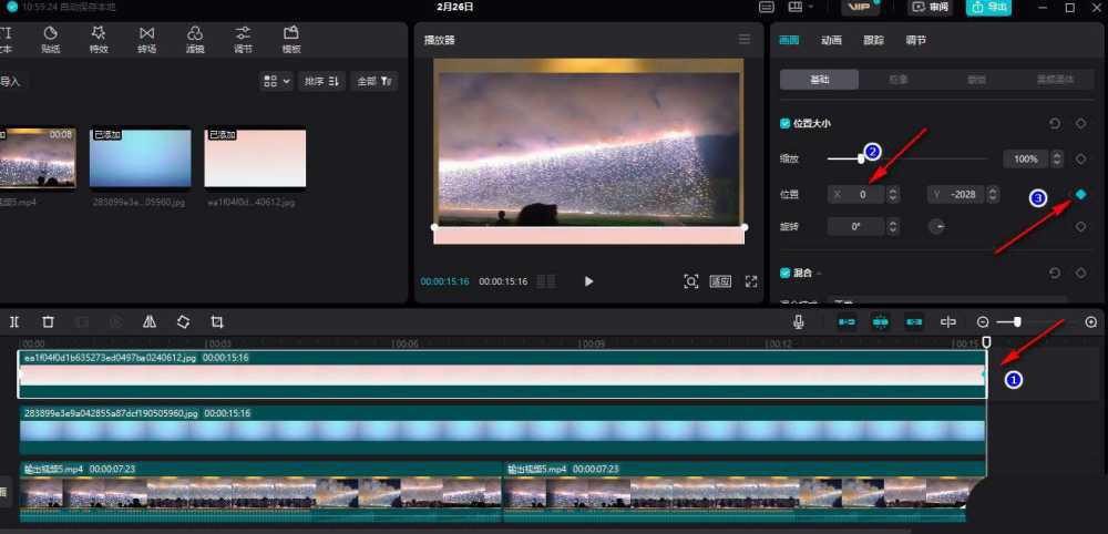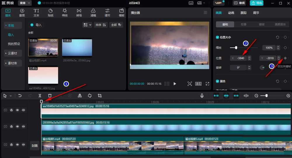 4、接着我们点击第一个背景的开头位置,然后在“X处”输入“-3840”,再在右侧点击“添加关键帧”图标,这里的“-3840”我们也可以直接拖动背景图片,将其向左移出视频画面即可,需要注意的是我们需要保持“Y”不变,所以要记住Y的大小,否则上下两个背景图片会出现一高一低的情况。