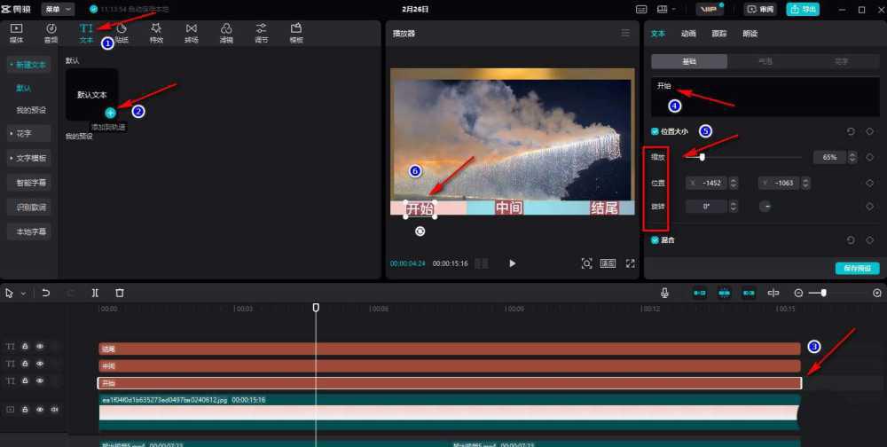 6、在添加文字时,我们点击“文本”选项,然后可以选择自己喜欢的文字模板,也可以直接使用默认模板,接着我们在轨道中将文字轨道拉长到和视频同一长度,然后完成文本内容的编辑以及文字缩放、类型的设置,最后将画面中的文字拖入到进度条中即可。