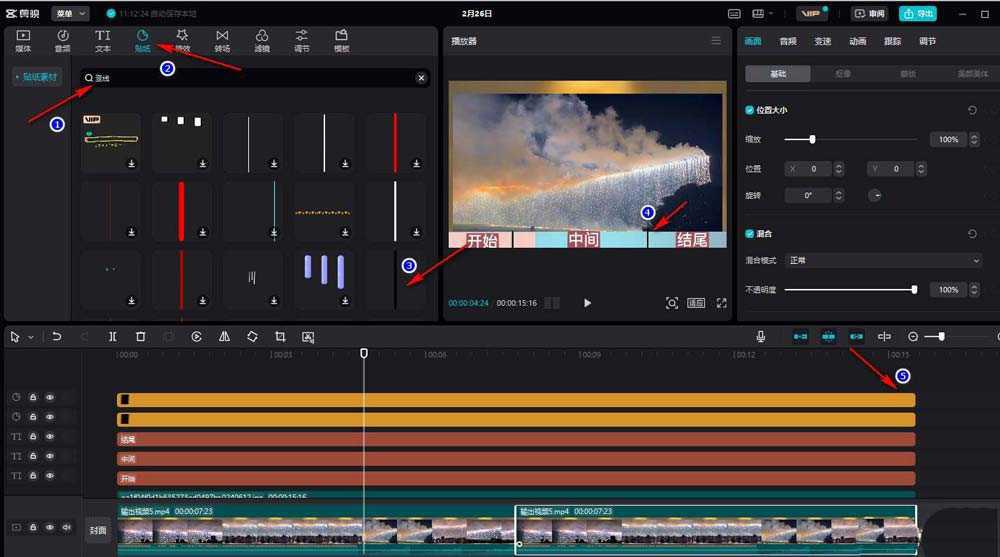 7、添加好文字之后,我们再点击“贴纸”工具,然后搜索“竖线”,将自己喜欢的竖线类型添加到轨道中,同样拉长长度,然后在画面中将其调整大小并放入进度条区域即可。