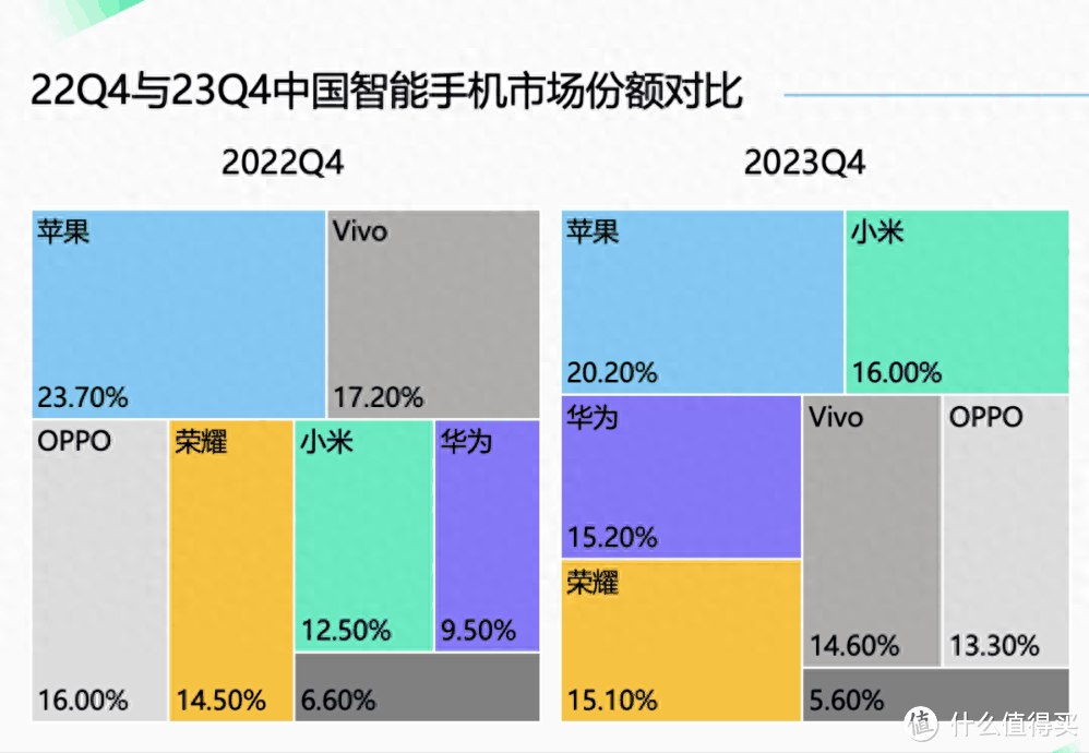 如上图所示,2023年4季度,苹果的销量虽然是中国第一名,但相比于2022年4季度,下滑了3.5个百分点,销量下滑了13%左右。