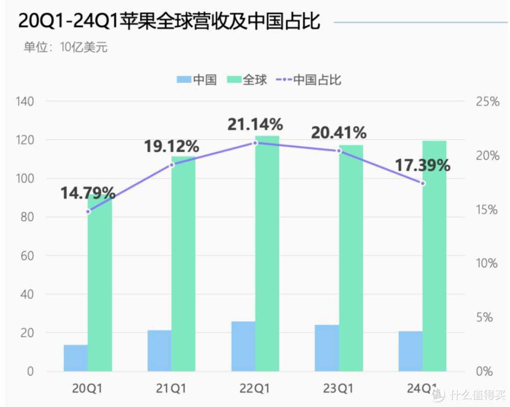 同时在苹果所有营收中,来自于中国地区的营收占比,也从上年同期的20.41%,下滑至17.39%了,是最近4年以来的最低值。