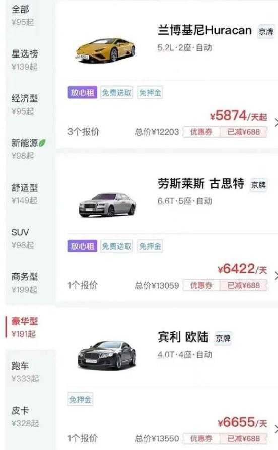 这个租金价格相当高昂,甚至比兰博基尼、宾利、劳斯莱斯等超豪华车更贵,例如劳斯莱斯古斯特的租金价格为6422元/天。