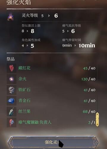 1、在游戏中,灵火祭坛的等级最高可以升至6级,我们可以点击强化火焰,然后使用材料升级。