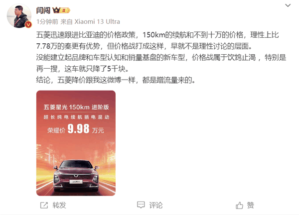 闫闯认为,五菱降价和他微博一样,都是蹭流量来的。