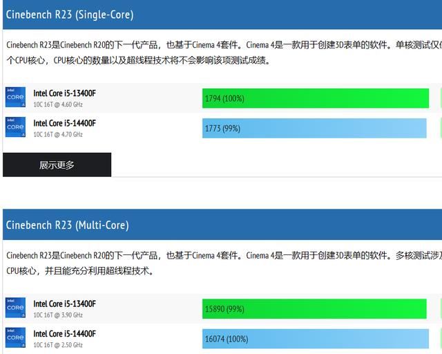 在Cinebench R23平台中,Core i5-13400F的单核性能得分为1794分,多核性能得分为15890分,Core i5-14400F的单核性能得分为1773分,多核性能得分为16074分。