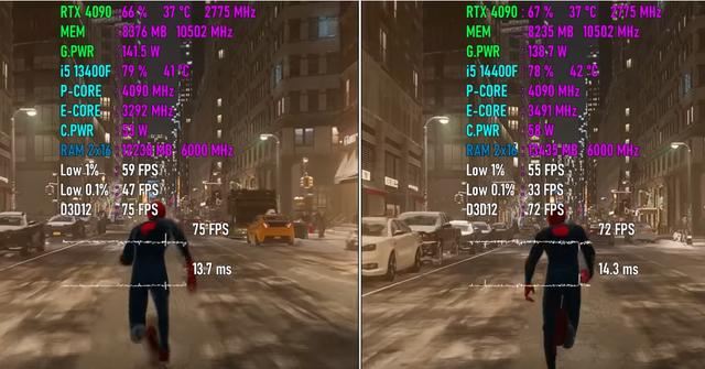 在平均帧速方面,Core i5-14400F平台比Core i5-13400F平台低3 FPS,最低瞬时帧速低4 FPS,帧时间高0.6ms,在性能方面略低一点点,但都在误差范围内,基本持平。功耗高。