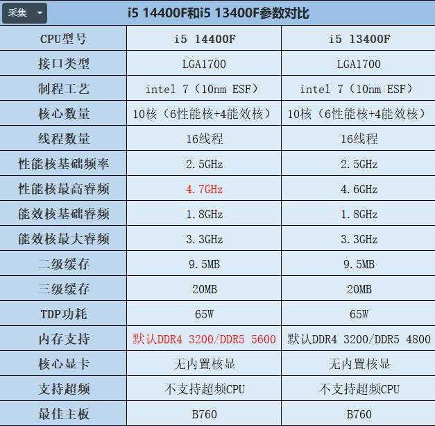 从参数对比来看,i5 14400F相比i5 13400F最大区别主要在于频率的提升,睿频仅提升了100MHz,内存默认频率支持上从DDR5 4800提高至5600MHz,其它参数保持一致,由此可见,两者性能差距极小,i5 14400F无疑就是i5 13400F马甲版。