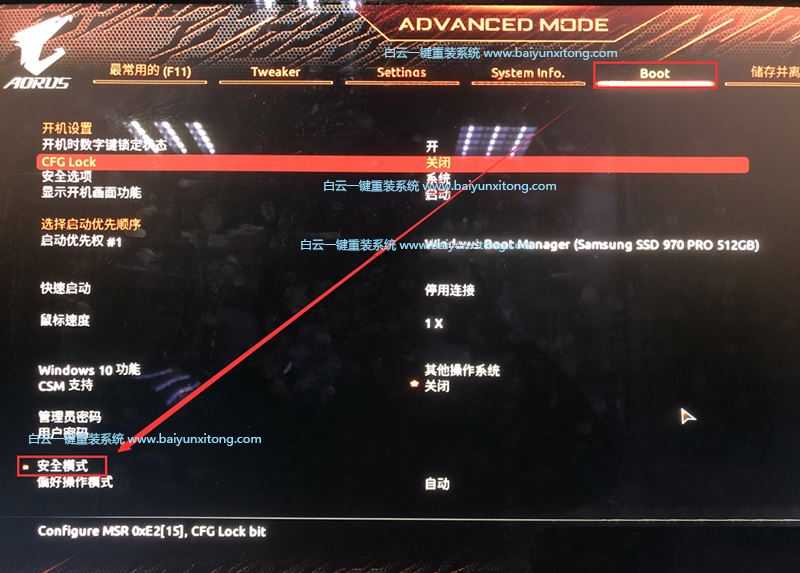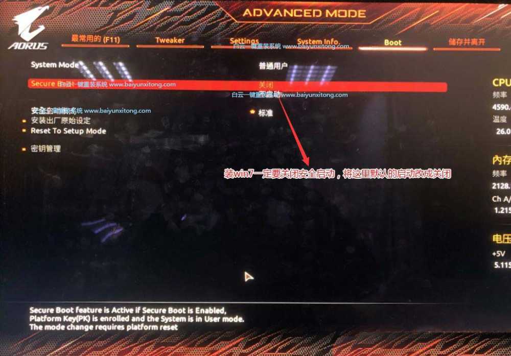 3、按键盘方向键,切换到Boot选项卡,进入安全启动模式,将Secure Boot改成关闭,意思关闭安全启动,安装Win10不关闭安全启动也可以;
