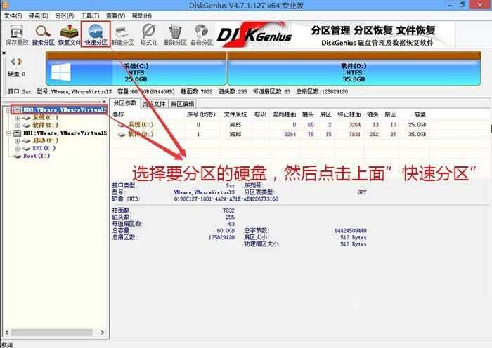 2、DiskGenius分区工具菜单栏,选择要分区的磁盘,然后点击上面的快速分区;