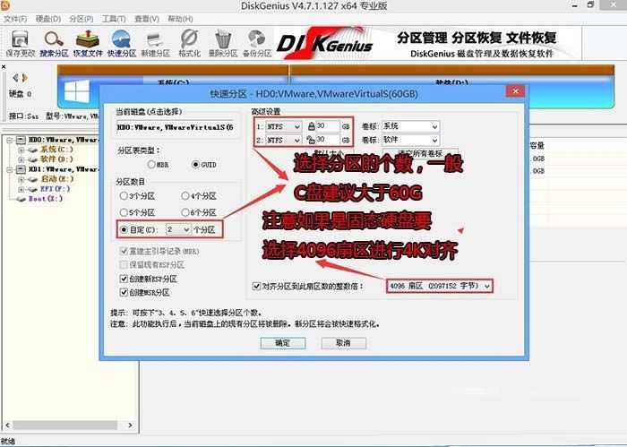 3、快速分区窗口中,选择GUID分区表类型,然后选择分区数目(大家可以根据实际情况看要划分多少个分区),勾选创建新ESP分区和创建MSR分区,然后就是磁盘空间大小的设置,推荐C盘大小大于60G比较好,最后如果是SSD固态硬盘的话,要选择4096扇区进行4K对齐;