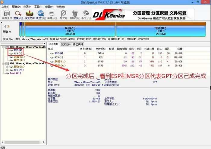 4、分区完成后,可以看到ESP和MSR分区已经完成,也就说明EFI系统引导分区已经建立完成,可以安装系统了;