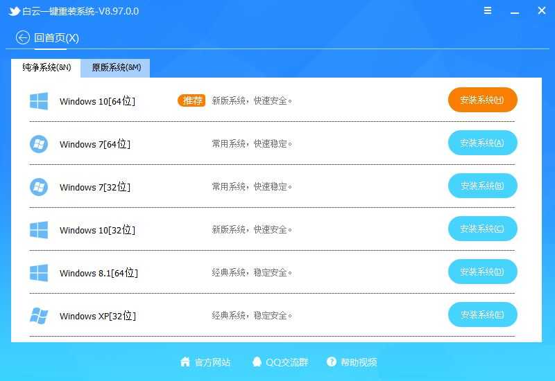 2、根据自己的需要选择Win10纯净系统或Win10原版系统,选择好之后,点击安装系统,软件在接下来的步骤,会自动下载系统文件,下载完成后会自动重启进行系统安装;