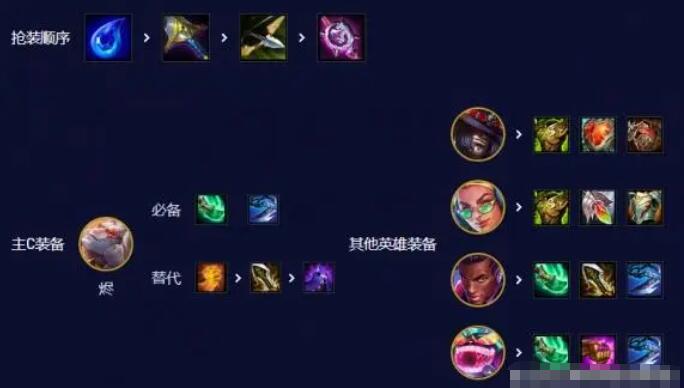 1、中期可以用超粉女枪打工,物理装备给卡莎或两星女枪。