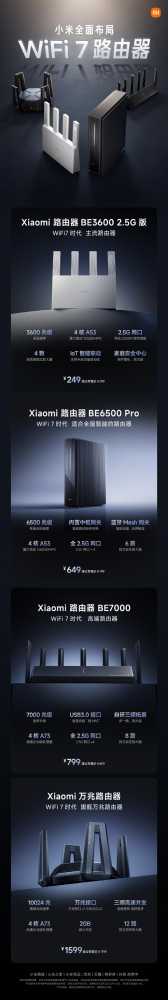 今日,小米路由器官微以一图的形式,介绍了小米已经发布的四款Wi-Fi 7路由器,分别为小米路由器BE3600 2.5G版、小米路由器BE6500 Pro、小米路由器BE7000、小米万兆路由器。