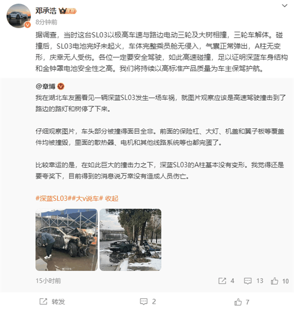 深蓝汽车CEO邓承浩在转发这条微博是表示:据调查,当时这台SL03以极高车速与路边电动三轮及大树相撞,三轮车解体。