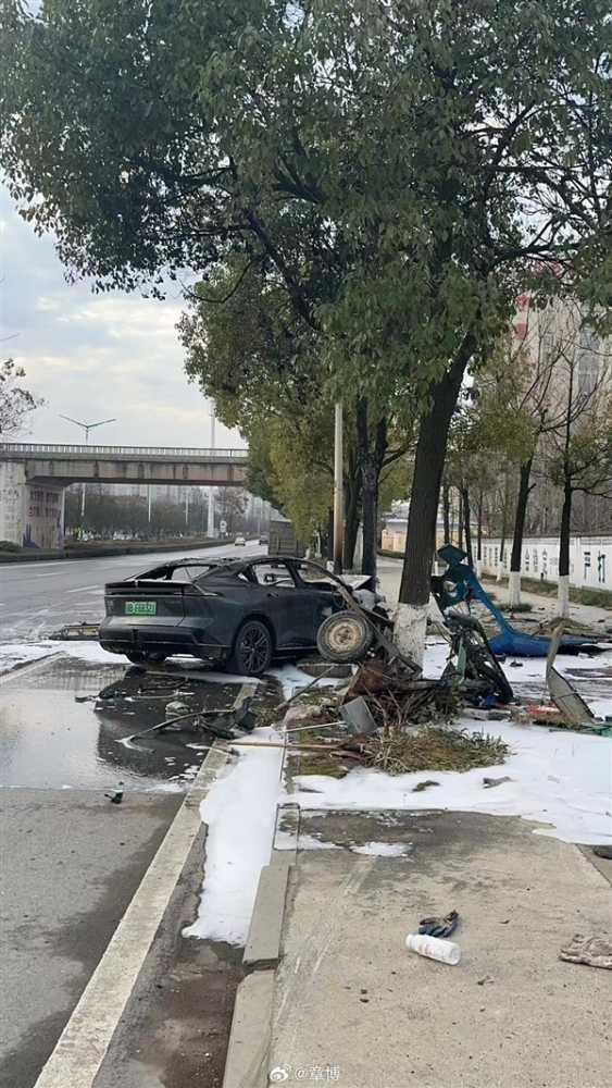 图里这台SL03非常惨烈,博主称:“车头部分被撞得面目全非,前面的保险杠、大灯、机盖和翼子板等覆盖件均被撞毁,里面的散热器、电机和其他线路系统等也都完蛋了。”