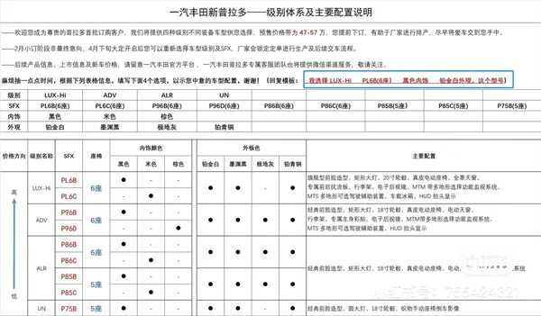 叮当号2月24日消息,近日,全新一汽丰田普拉多预售价和部分配置信息迎来曝光。