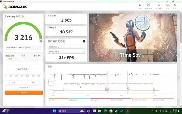 而在 3D Mark 的 Time Spy 测试中,小新的 GPU 也跑到了 2800 多分,稳稳超越了 1050Ti 显卡的分数。