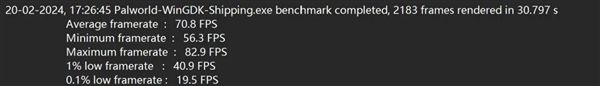 跑一个前段时间的大热游戏《 幻兽帕鲁 》,低画质平均帧率也能到 70 。