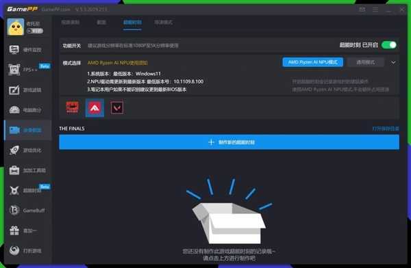 目前,这个功能支持《永劫无间》《无畏契约》和《 The Finals 》三款游戏,只要在功能选项里打开 AMD 处理器专属 NPU 模式就可以了。