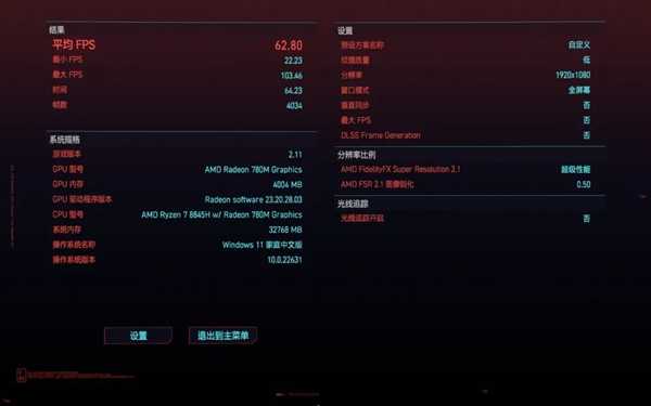 比如在《赛博朋克 2077 》性能测试中,小新在 1080P 全低画质,并开启 FSR 2.1 超级性能的情况下,已经跑出了超过 60 帧的平均帧数。