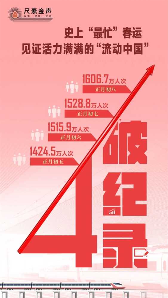 叮当号2月24日消息,中国铁路部门透露,1424.5万人次、1515.9万人次、1528.8万人次、1606.7万人次,龙年正月初五至初八,全国铁路旅客发送量连续4天刷新春运单日旅客发送量历史纪录。