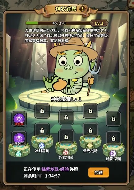 灵光文明神农许愿怎么玩?冒险家们背包里的龙珠是不是多到放不下了呢?别着急,快来使用龙珠向神龙许愿吧!不过,龙珠可是有不同类型的哦,记得不要放错想要的产出类型啦! 灵光文明神农许愿玩法攻略详解 1、放置许愿龙珠,可以向神龙许愿,时辰到后根据放置龙珠类型的不同可能获得钻石、经验、装备结晶或元素结晶。 2、经验、装备结晶和元素结晶的产出,与怪物工厂产速有关。 3、龙珠许愿结束后,除龙珠内的奖励外,还可以获取宝藏的神龙之力,并提升宝藏等级。宝藏等级越高,奖励越丰富,直至奖励达到上限。