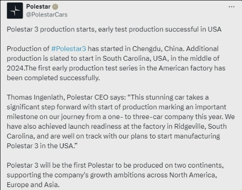同时,美国南卡罗来纳州的工厂已完成首批生产测试,并将于2024年年中开启量产,而极星3将成为首款同时登陆两大洲的极星车型。
