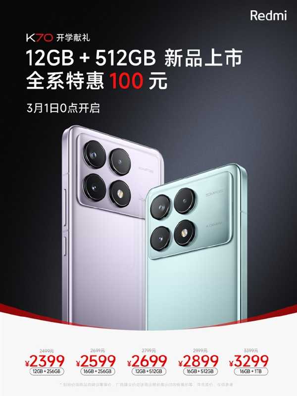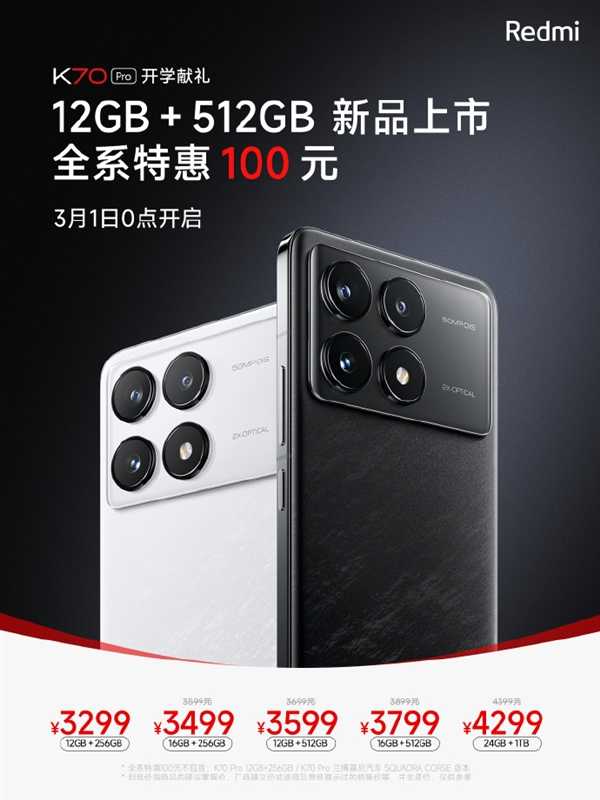 另外,Redmi K70、Redmi K70 Pro还将在3月1日0点起全系特惠100元(K70 Pro 12GB+256GB和冠军版除外)。