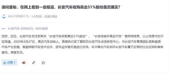 今日,有投资者在互动平台上提问,“在网上看到一些报道,长安汽车收购高合51%股份是否属实?”